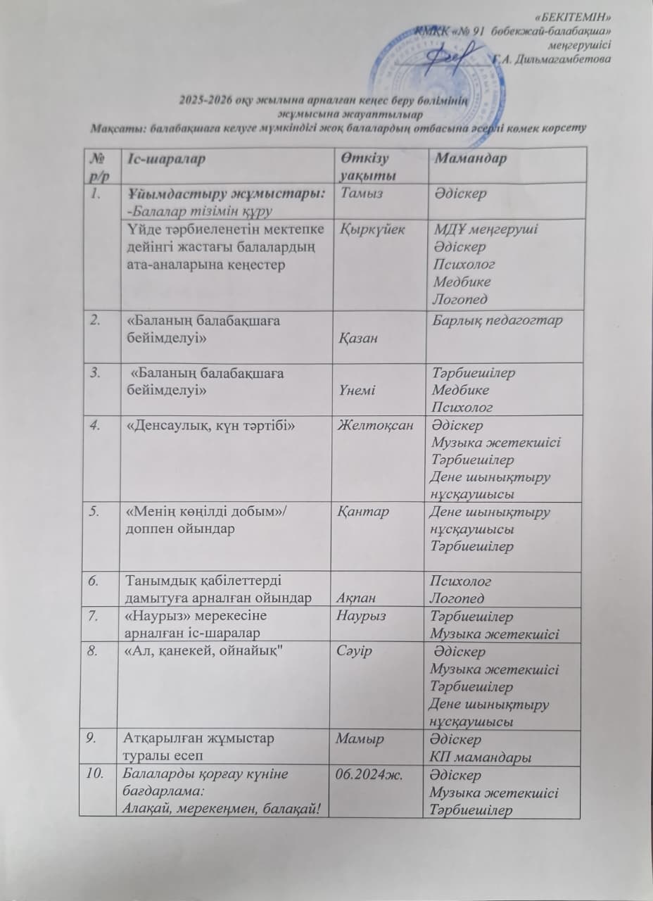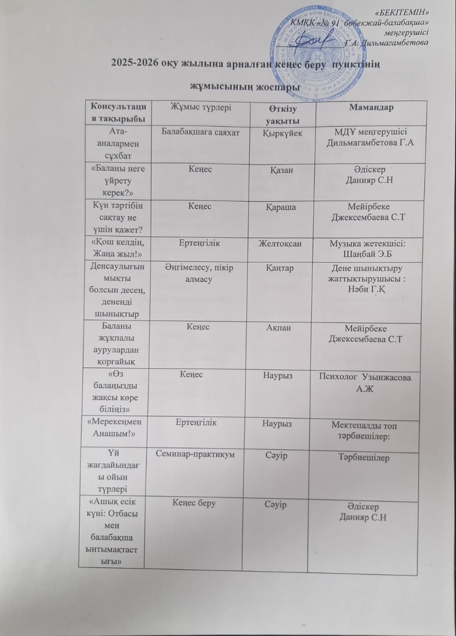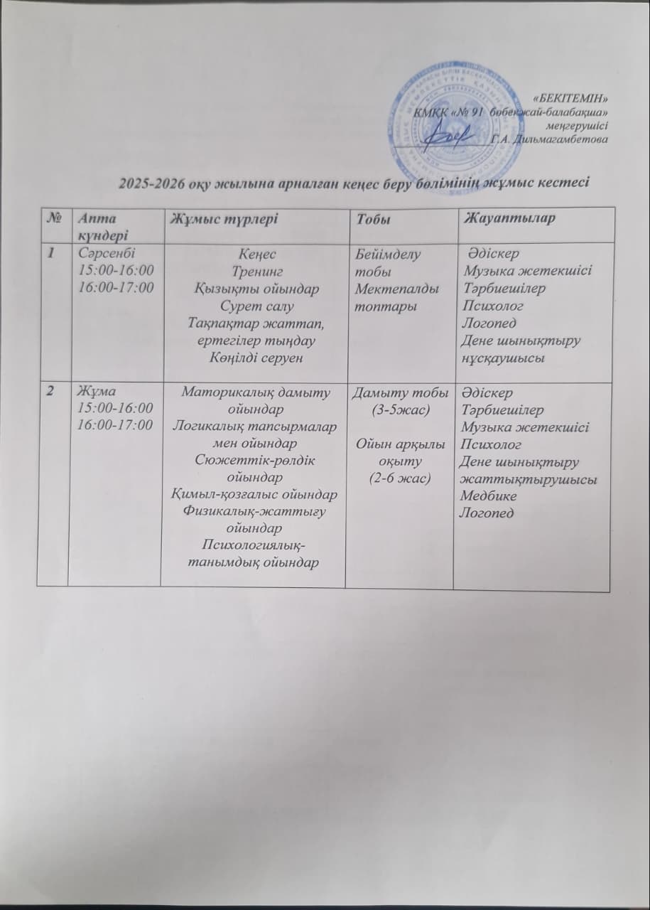 2024-2025 оқу жылына арналған кеңес беру бөлімінің жұмыс кестесі