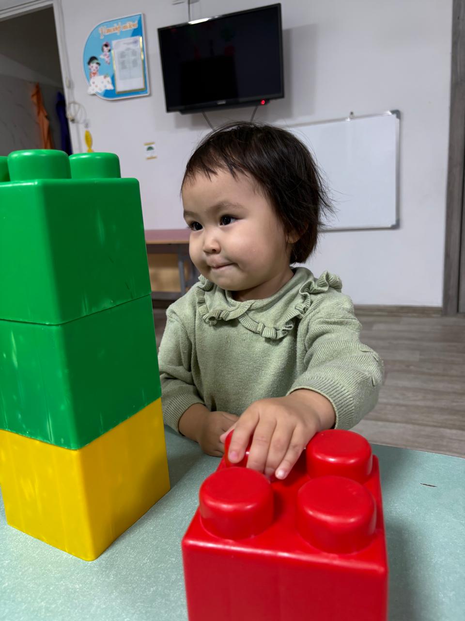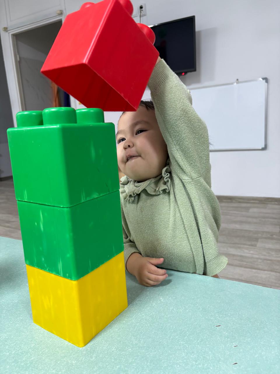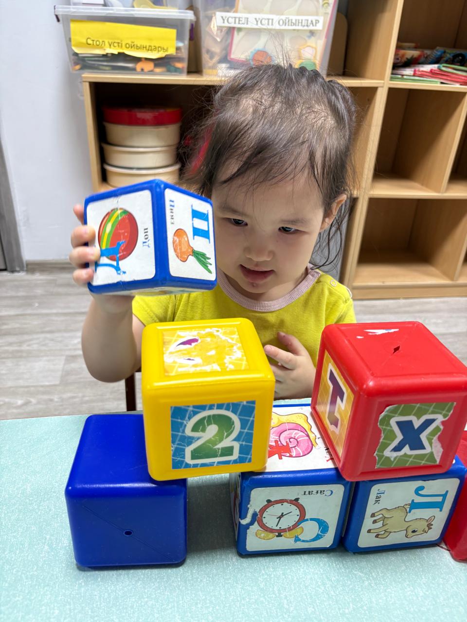 Мақсаты: Балаларды геометриялық пішіндермен (текше, кірпіш) таныстыруды жалғастыру. Түстерді ажырата білуге, бөлшектерді бір-бірінің үстіне қою арқылы қарапайым құрылыстар (үй, қоршау) салуға үйрету. Ойын арқылы ептілікке баулу.