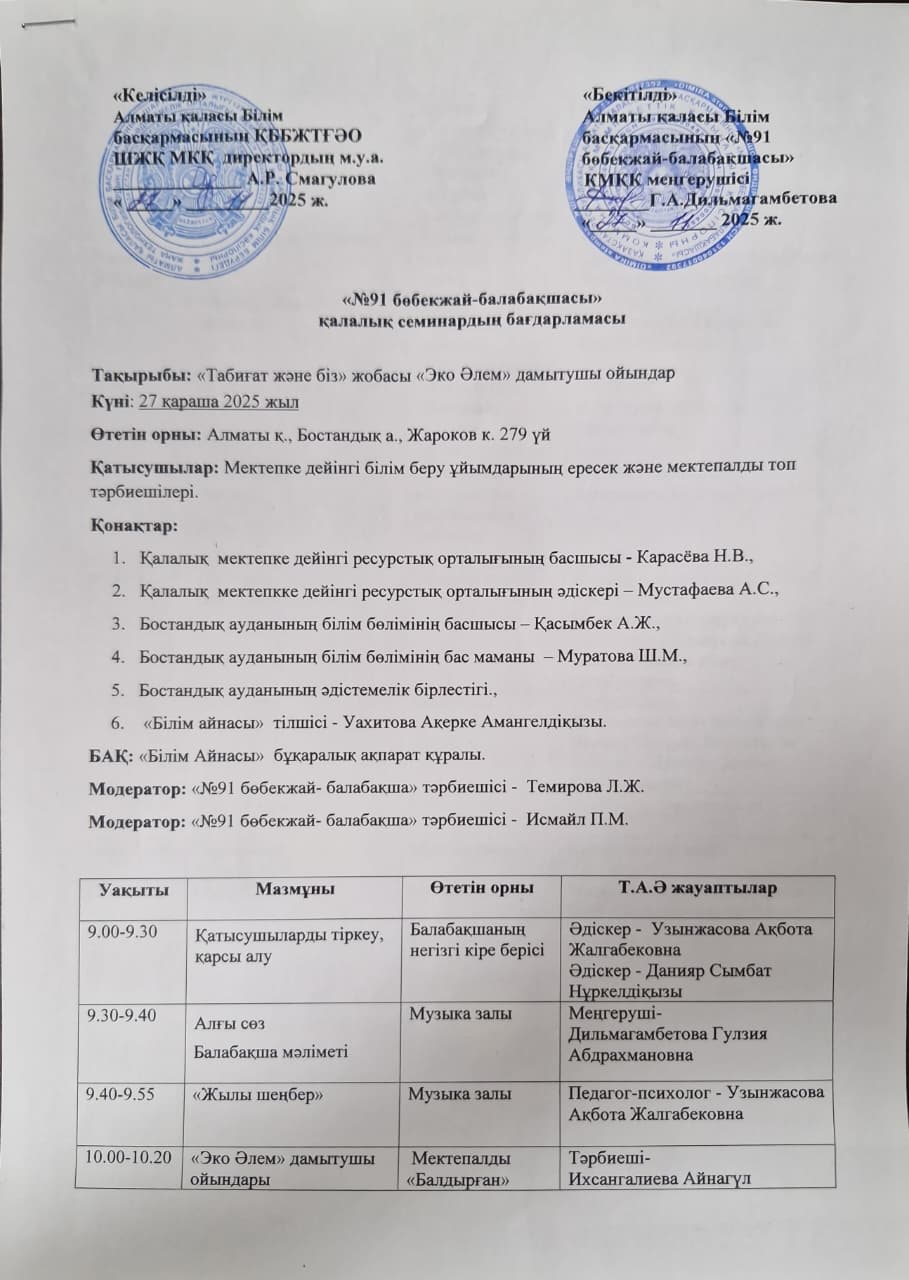 2025 жылғы 27 қарашада Алматы қаласы, Бостандық ауданы КМҚК «№91 бөбекжай-балабақшасы» базасында қалалық семинар өтті.