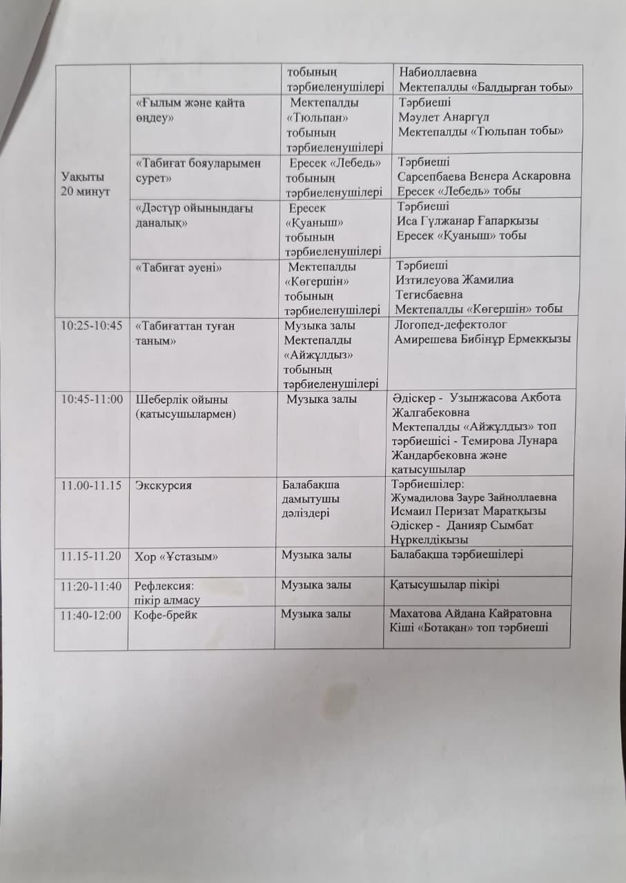 – Ұлттық құндылықтарды насихаттауға бағытталған ойындар таныстырылды. Жауаптылар: Иса Г.Ғ., Исмаил П.М.., Махатова А.К. - «Табиғат әуені»